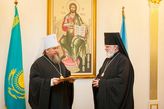 В завершение заседания Глава Православной Церкви Казахстана и архипастыри Митрополичьего Округа поздравили архиепископа Чимкентского и Таразского Елевферия с 60-летием со дня рождения. Митрополит Александр вручил владыке Елевферию список Донской иконы Божией Матери и благодарственную Митрополичью грамоту.