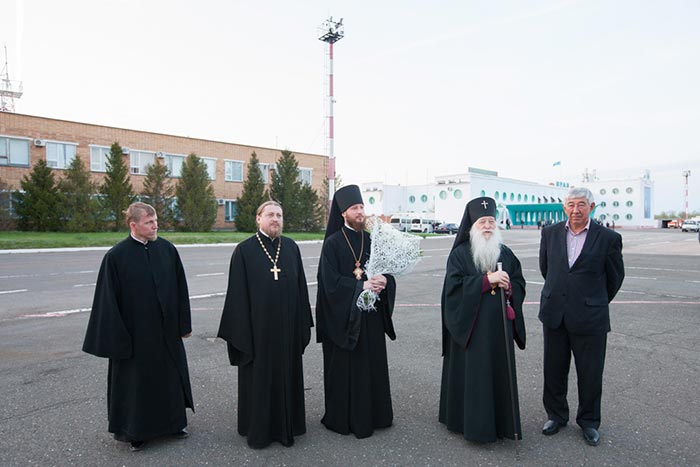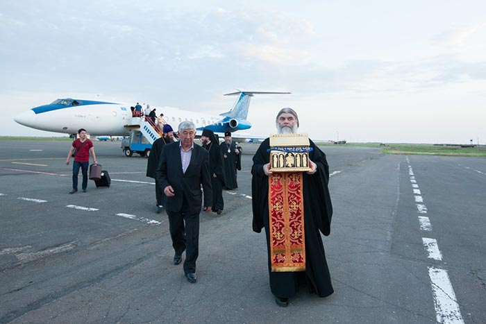В аэропорту Тараза Пояс Божией Матери и сопровождающую делегацию во главе с митрополитом Астанайским и Казахстанским Александром провожали: архиепископ Чимкентский и Таразский Елевферий, настоятель Успенского собора города протоиерей Георгий Власенко, духовенство епархии; руководитель Агентства по делам религий Жамбылской области С.У. Айдапкелов.