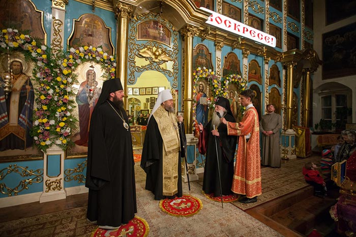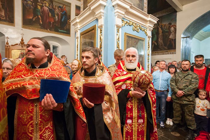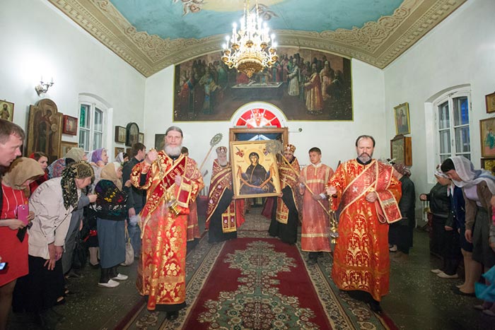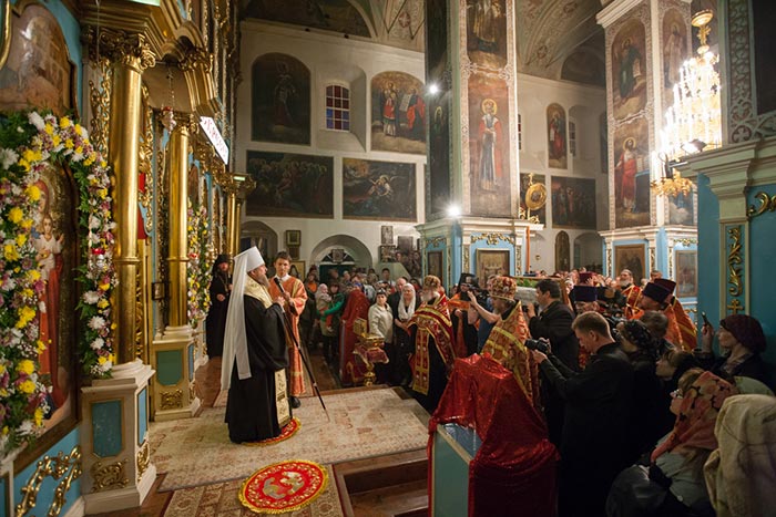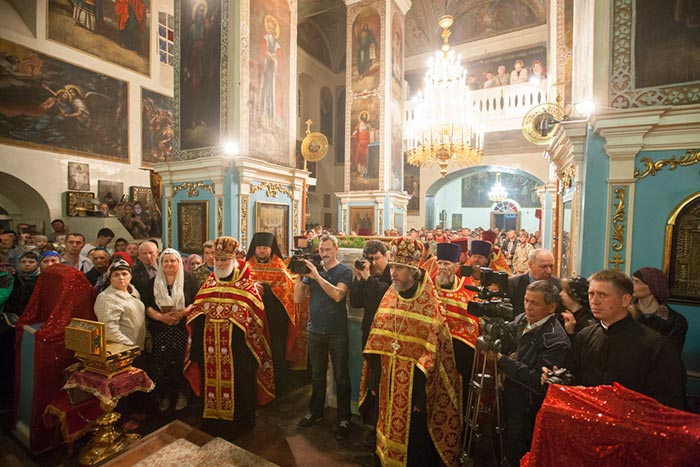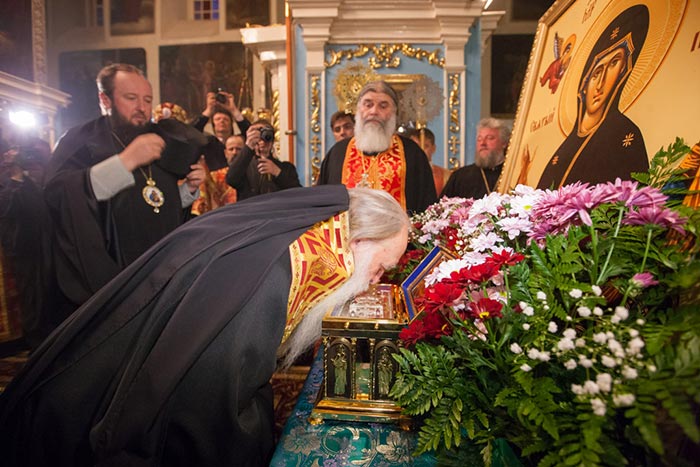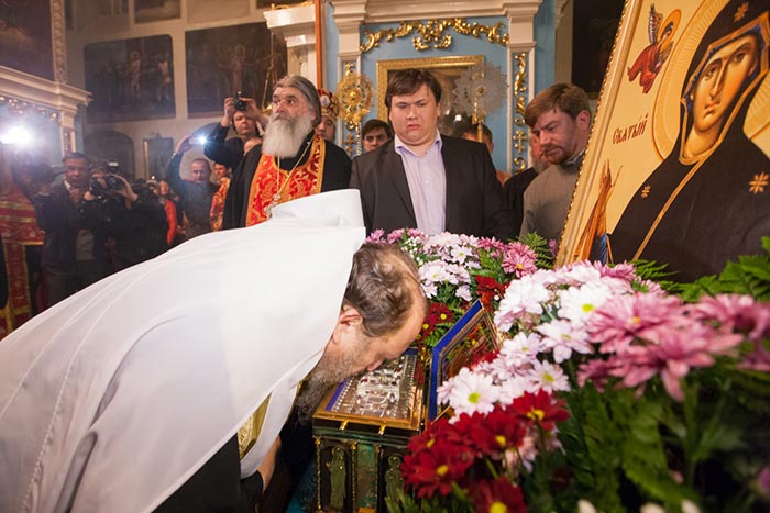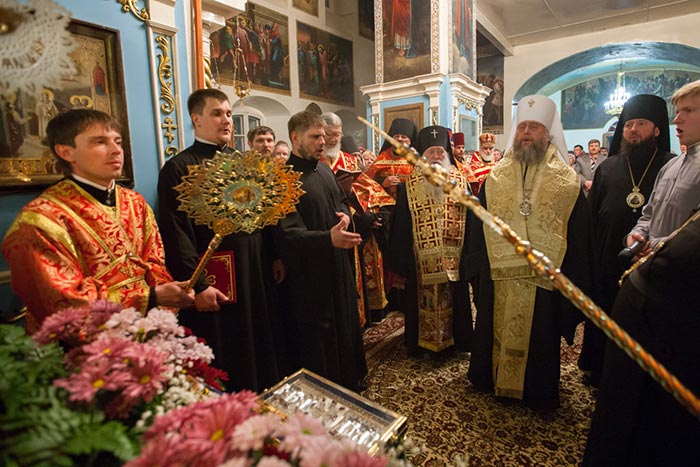 В главном храме епархии митрополит Александр, архиепископ Антоний и епископ Амфилохий в сослужении епархиального духовенства совершили молебен Пресвятой Богородице, после которого доступ к святыне открылся для верующих.