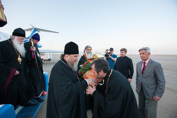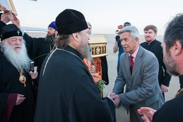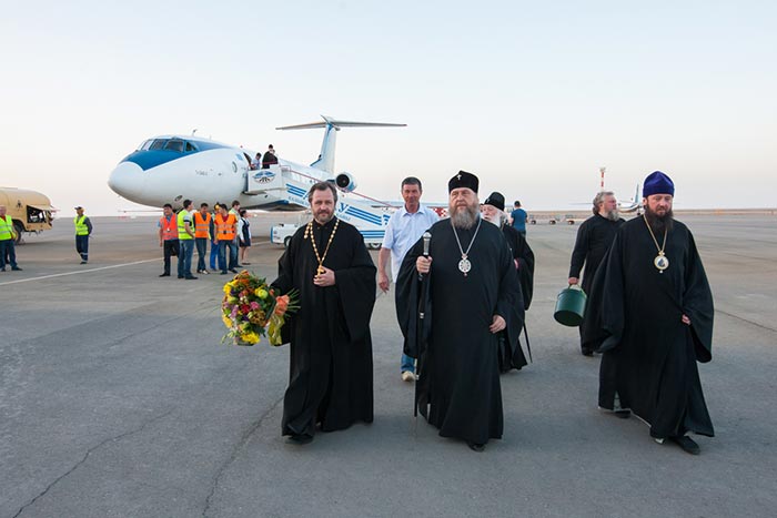 В Уральске к сопровождающей делегации присоединились: архиепископ Уральский и Актюбинский Антоний, настоятель Михаило-Архангельского собора Уральска архимандрит Феодосий (Курьянов), секретарь Уральской епархии игумен Дионисий (Козулев), секретарь епархиального управления архидиакон Василий (Крюков).