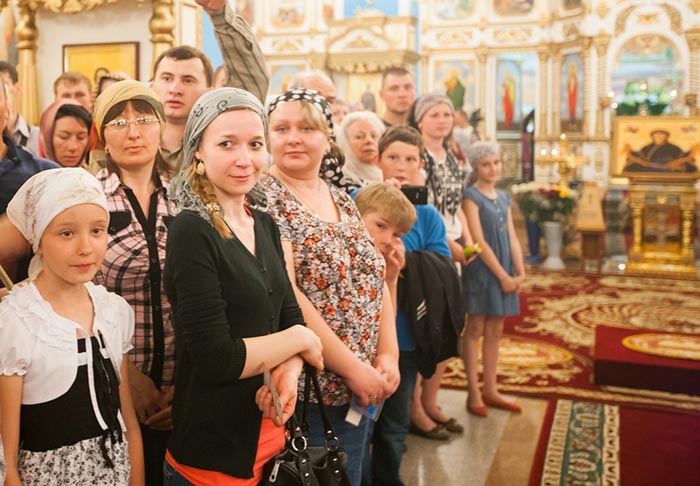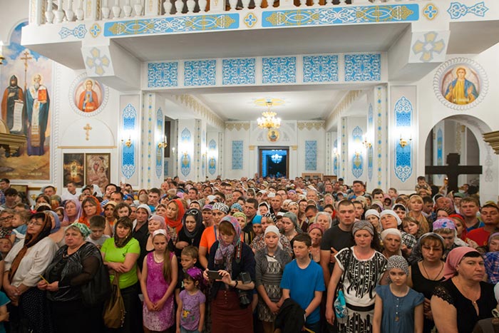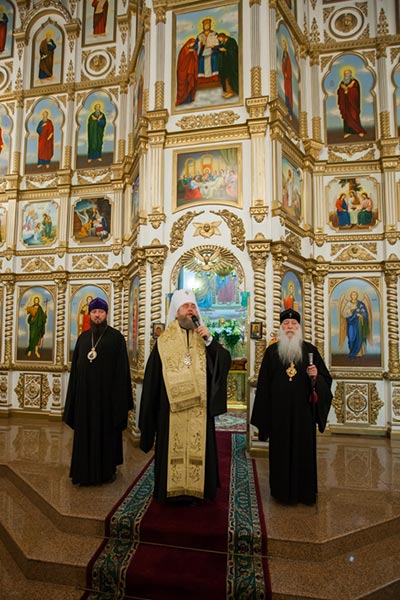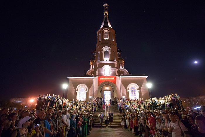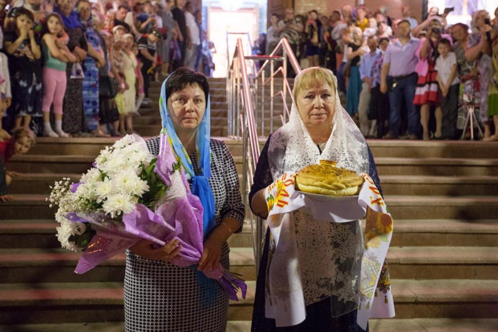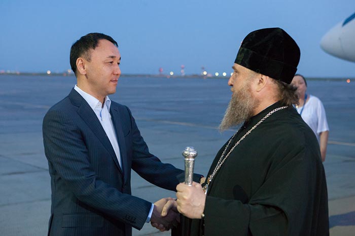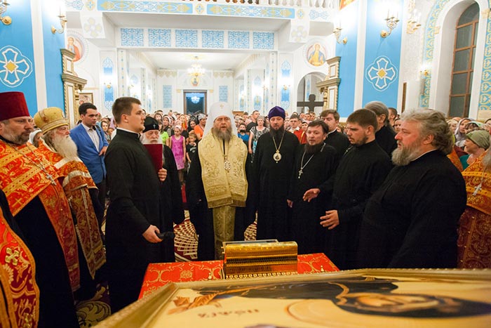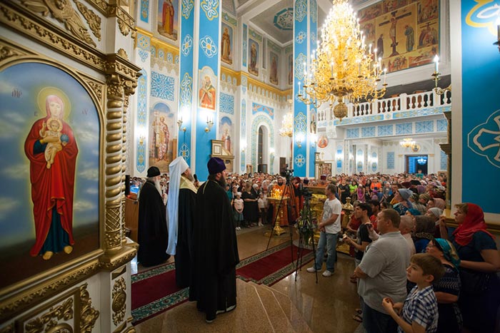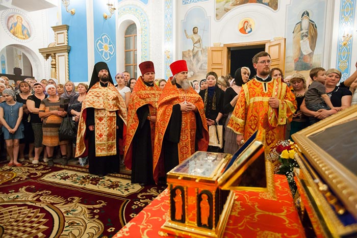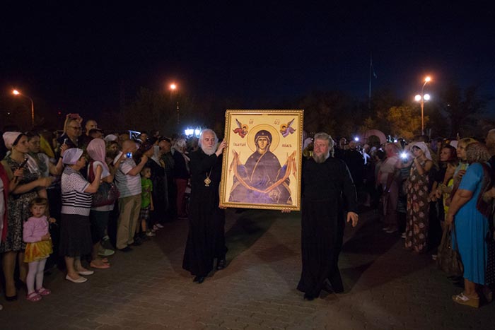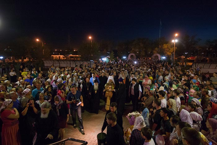 Глава Православной Церкви Казахстана, архиепископ Уральский и Актюбинский Антоний и епископ Усть-Каменогорский и Семипалатинский Амфилохий внесли ковчег с честным Поясом в ограду храма, где святыню встречали более трех тысяч человек. После архипастырского молебна началось поклонение верующих Поясу Богоизбранной Отроковицы.
