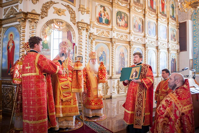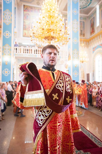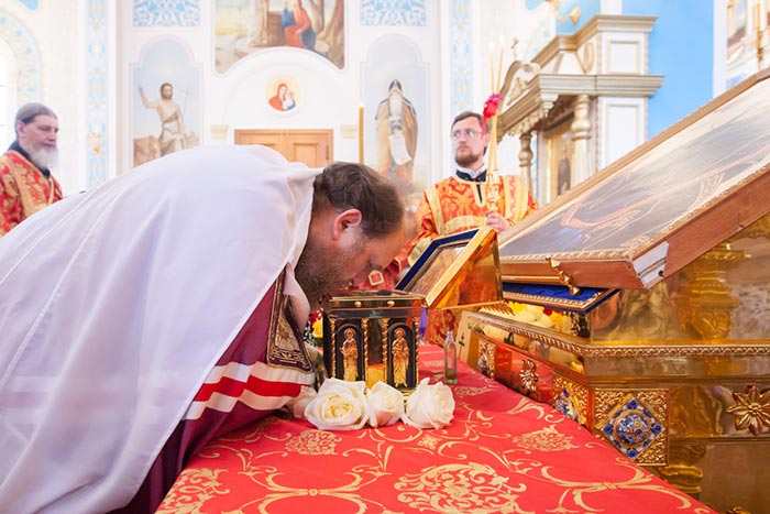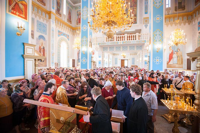 Перед входом в собор митрополит Александр прочитал молитву Пресвятой Богородице и похристосовался с народом. Архипастыри осенили ковчегом с Поясом Приснодевы Марии собравшихся, после чего Глава Митрополичьего округа окропил молящихся святой водой.
