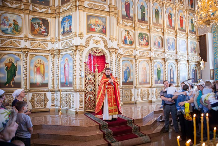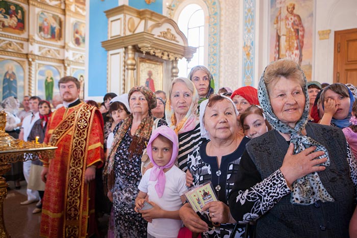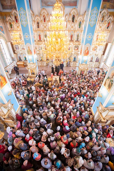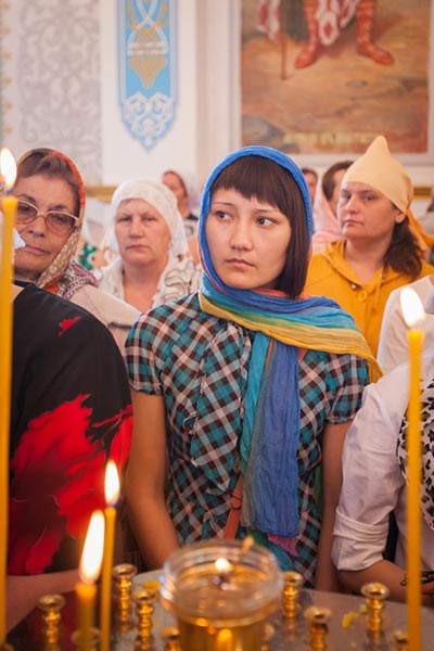 На протяжение всего дня Никольский собор Актюбинска был переполнен паломниками, поклоняющимися Честному Поясу Богоматери.