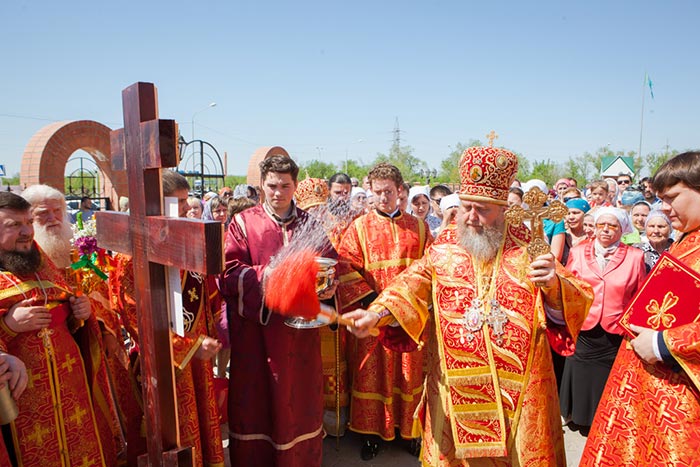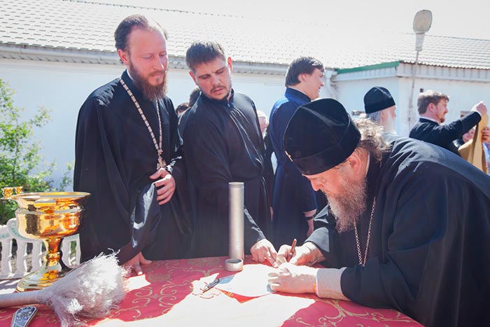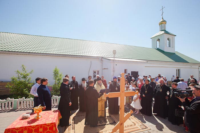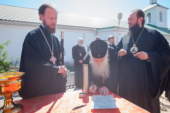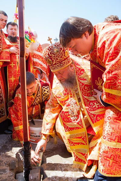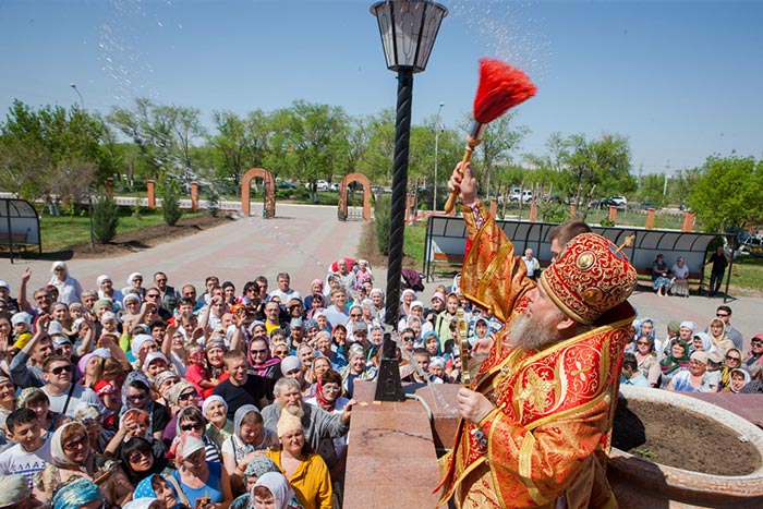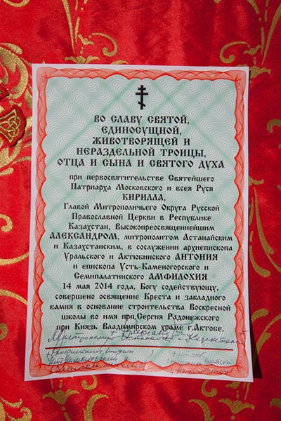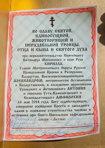 Глава Православной Церкви Казахстана совершил освящение креста и закладного камня в основание строительства водосвятной часовни на южной стороне соборной площади. Грамота об освящении закладного камня, подписанная владыкой митрополитом и архипастырями - участниками торжеств, была помещена в металлическую капсулу для закладки в фундамент часовни.