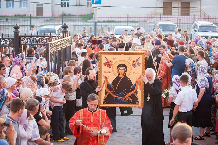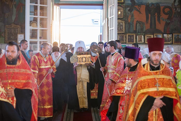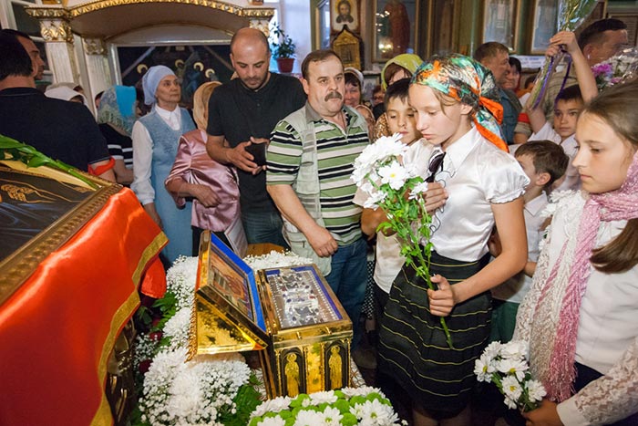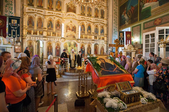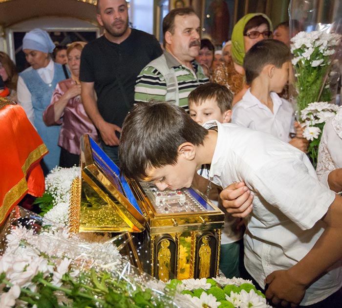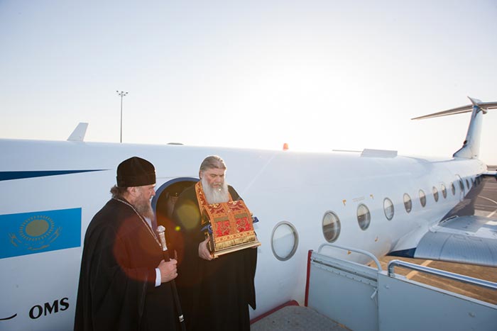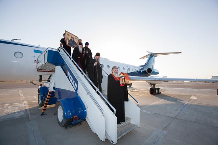 По прибытии святыню установили в Успенском соборе. Молебен, открывший паломничество многочисленных верующих к честной раке, совершил митрополит Астанайский и Казахстанский Александр в сослужении архиепископа Уральского и Актюбинского Антония, епископа Усть-Каменогорского и Семипалатинского Амфилохия и духовенства уральской епархии.