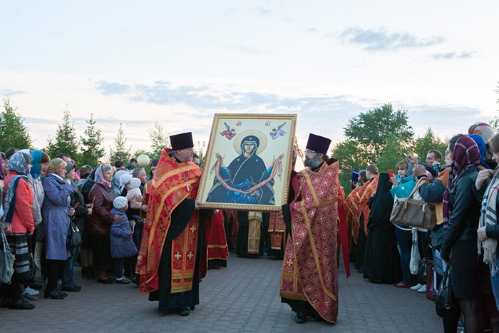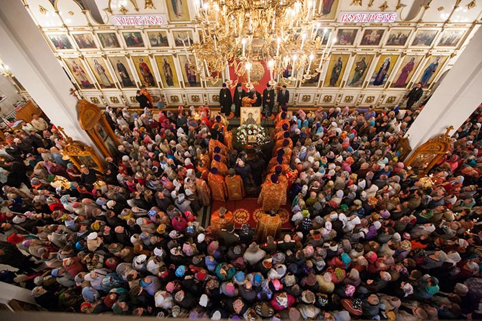 Молебном Пресвятой Богородице в Благовещенском кафедральном соборе было положено начало поклонению честному Поясу. Почтить святыню прибыли многочисленные верующие.