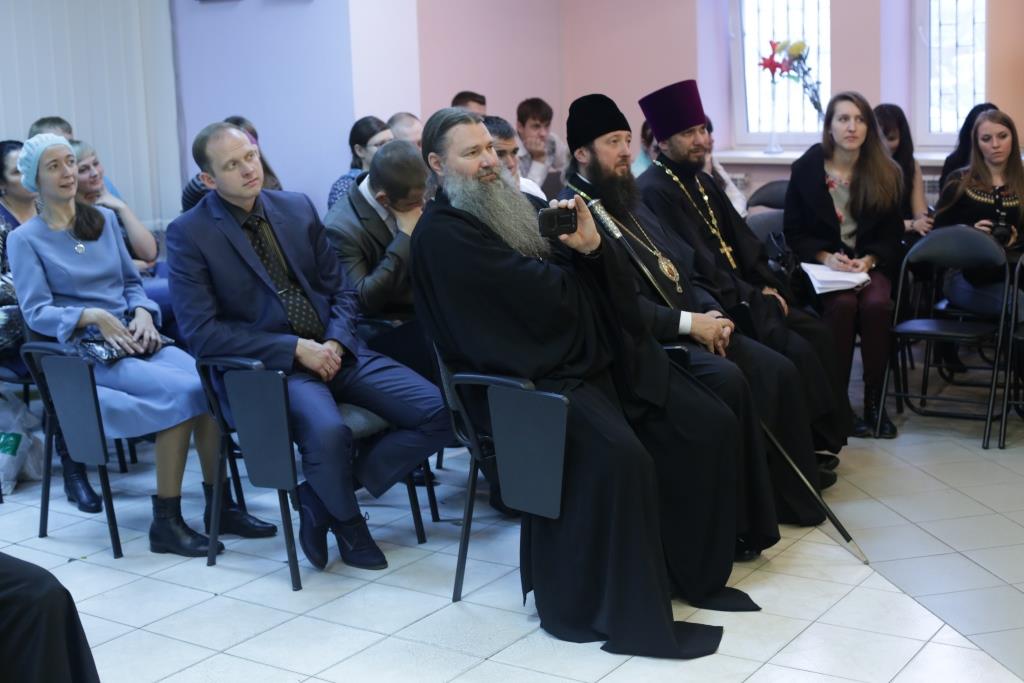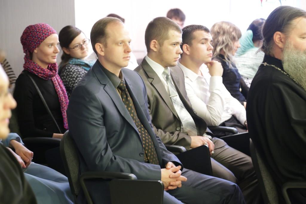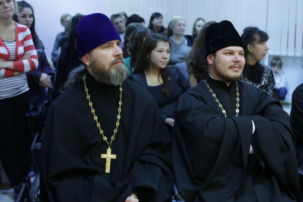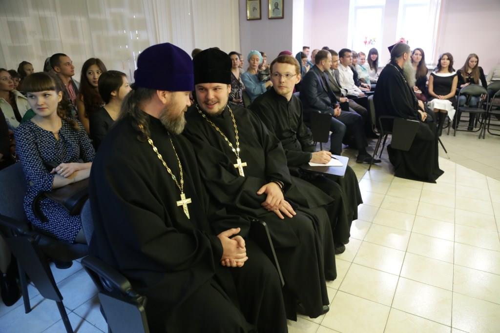 Актовый зал школы с трудом вместил всех гостей и участников торжества: членов Православных молодежных клубов епархии, воспитанников воскресных школ города и области, студентов городского филиала Московского Государственного университета Экономики, Статистики и Информатики.