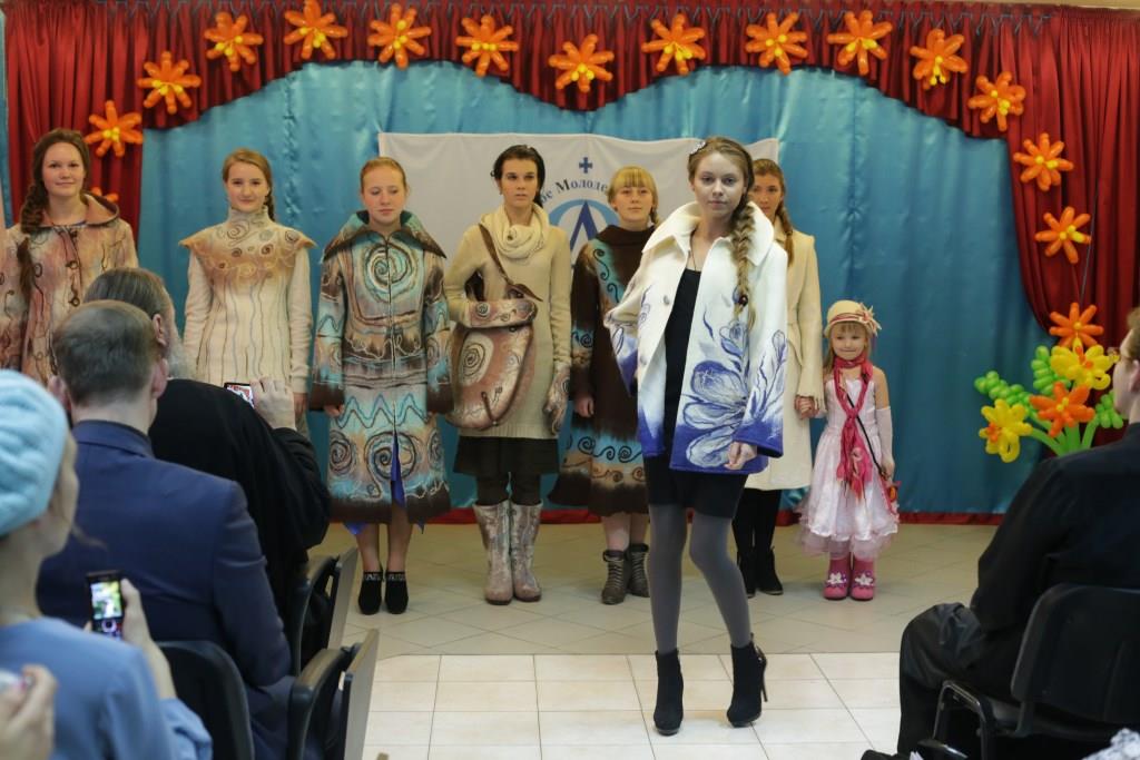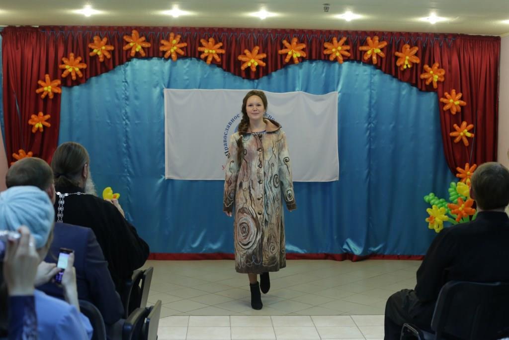 Украшением бала стал показ Православной моды. Свою осеннюю коллекцию: яркие и нарядные пальто, платья, жакеты, сумки, шляпки, обувь и украшения из войлока - представила модельер Мария Маркова.