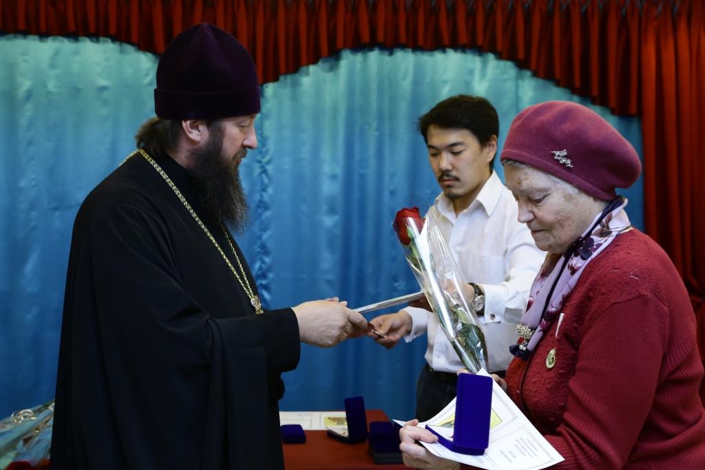 По случаю юбилейной даты были выпущены памятные наградные знаки нашего Митрополичьего округа. Вручая вам награды и медали Православной Церкви Казахстана, хотел бы поблагодарить вас за добрые труды, которые вы в силу ваших возможностей осуществляете в Усть-Каменогорском епархиальном управлении и при Свято-Троицком монастыре. Желаю всем нам благословенных успехов и милости Небес».