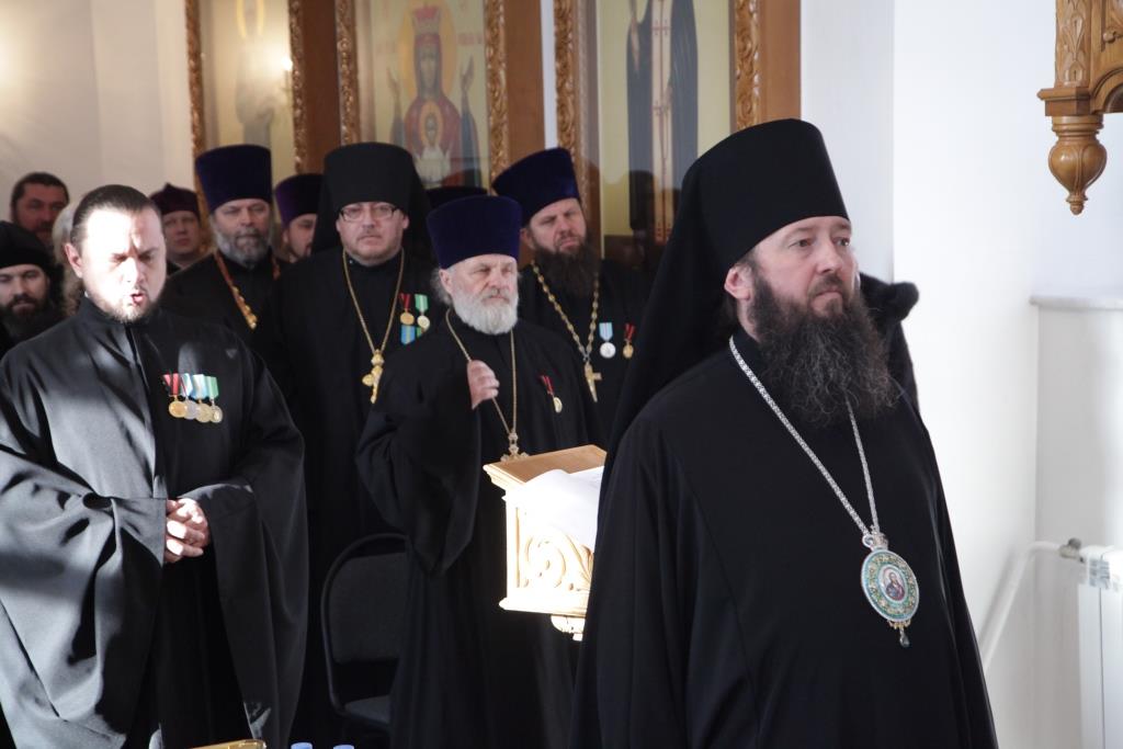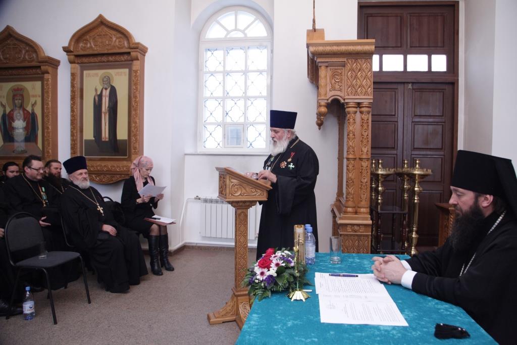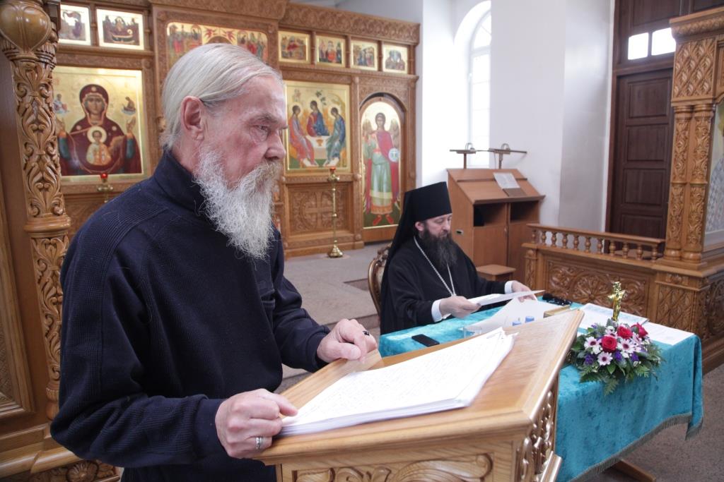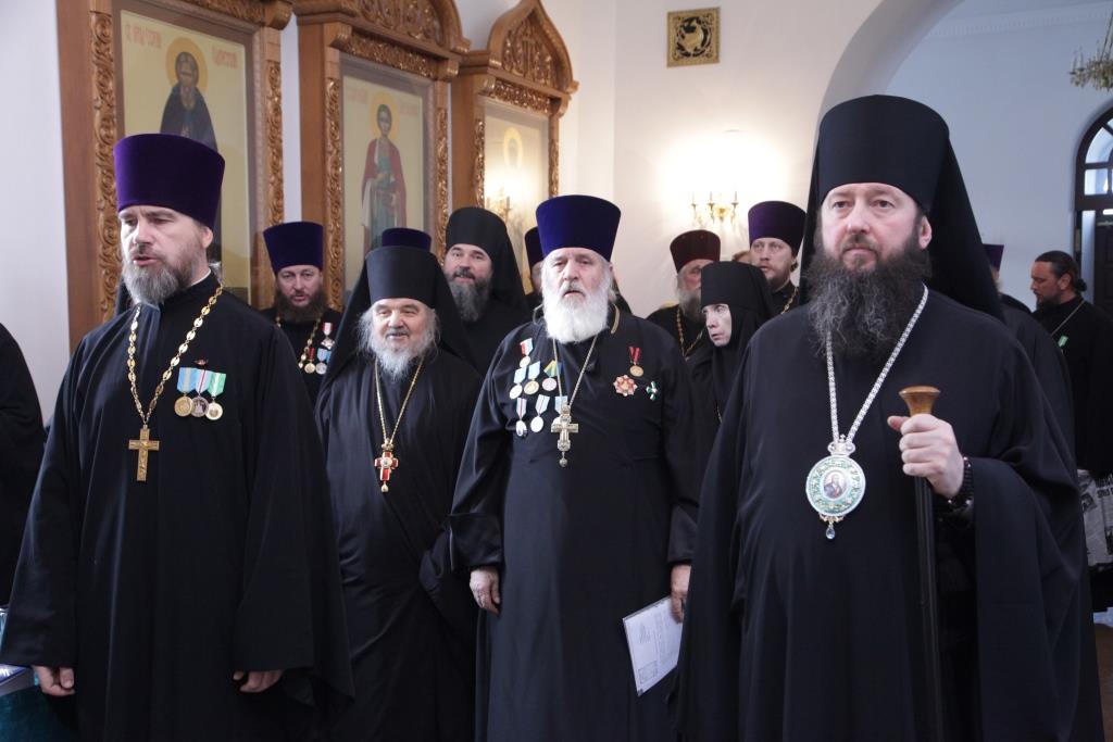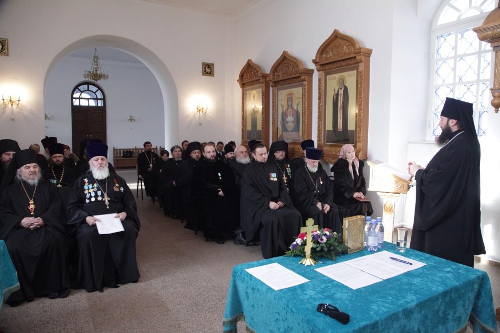 После братской трапезы, духовенство епархии перешло в Свято-Троицкий монастырский собор, где началась работа епархиального собрания. В ежегодном епархиальном мероприятии приняли участие: члены Епархиального совета, благочинные, председатели и секретари епархиальных отделов, настоятели и клирики приходов, ключари, монашествующие, сотрудники епархиального управления.