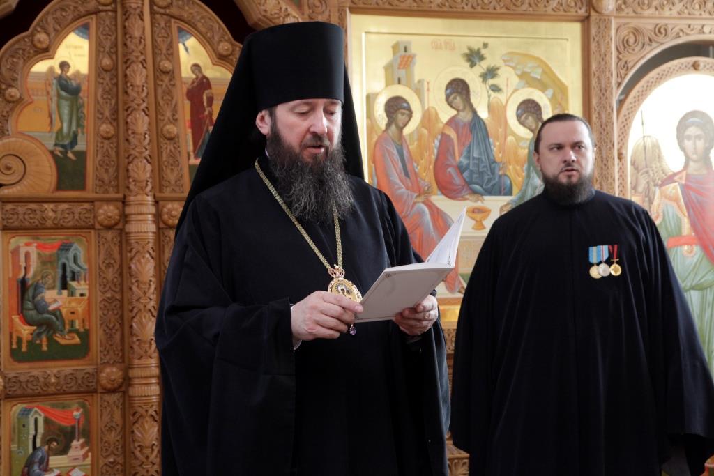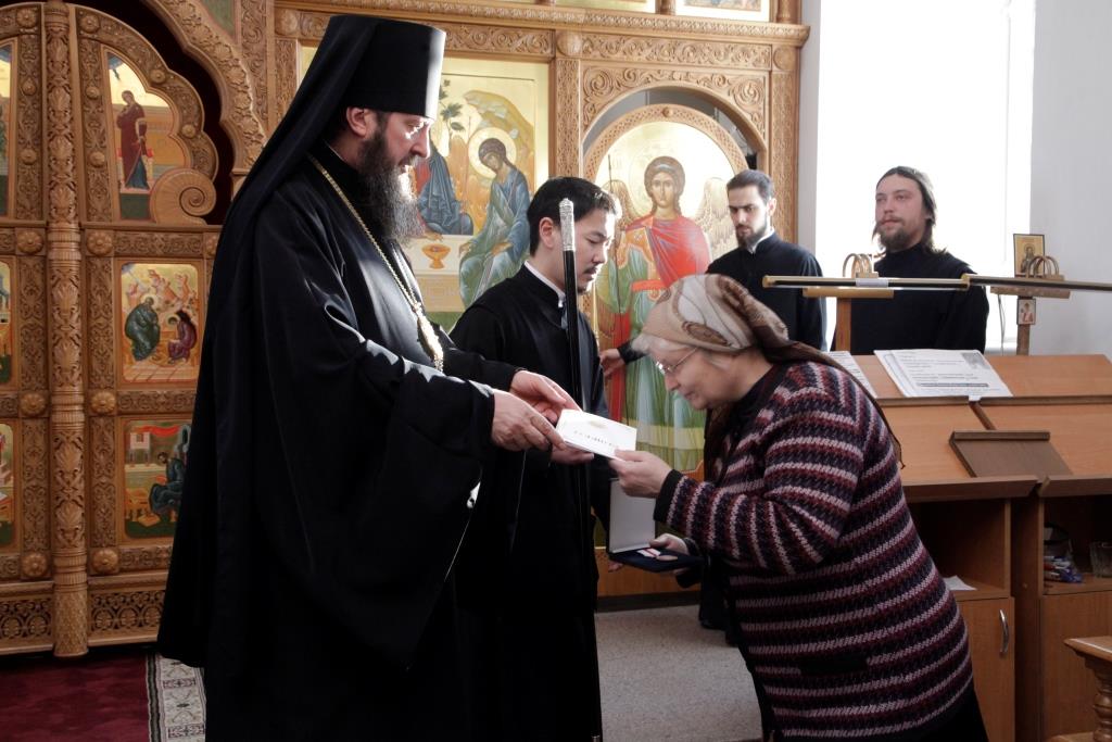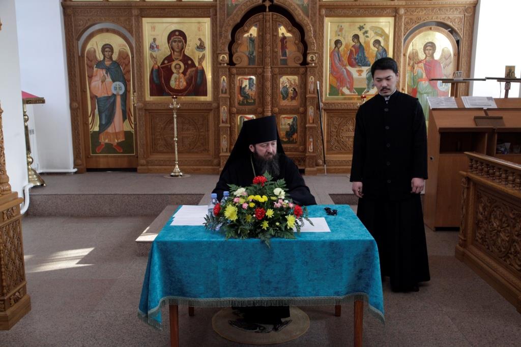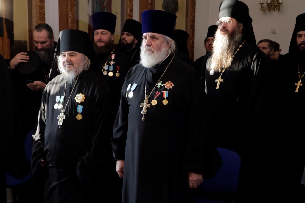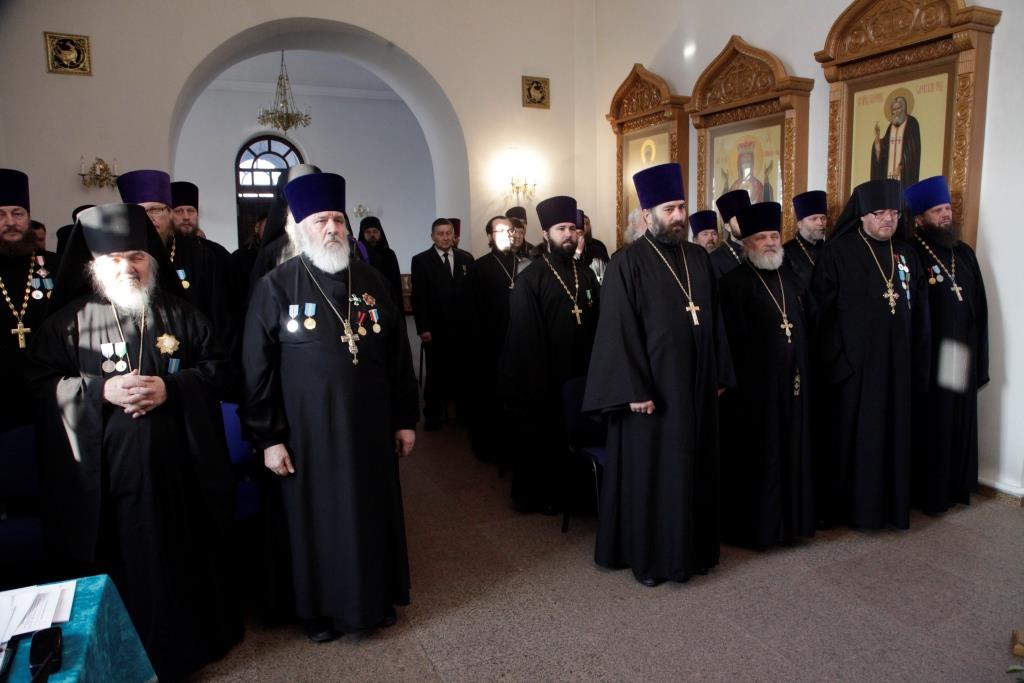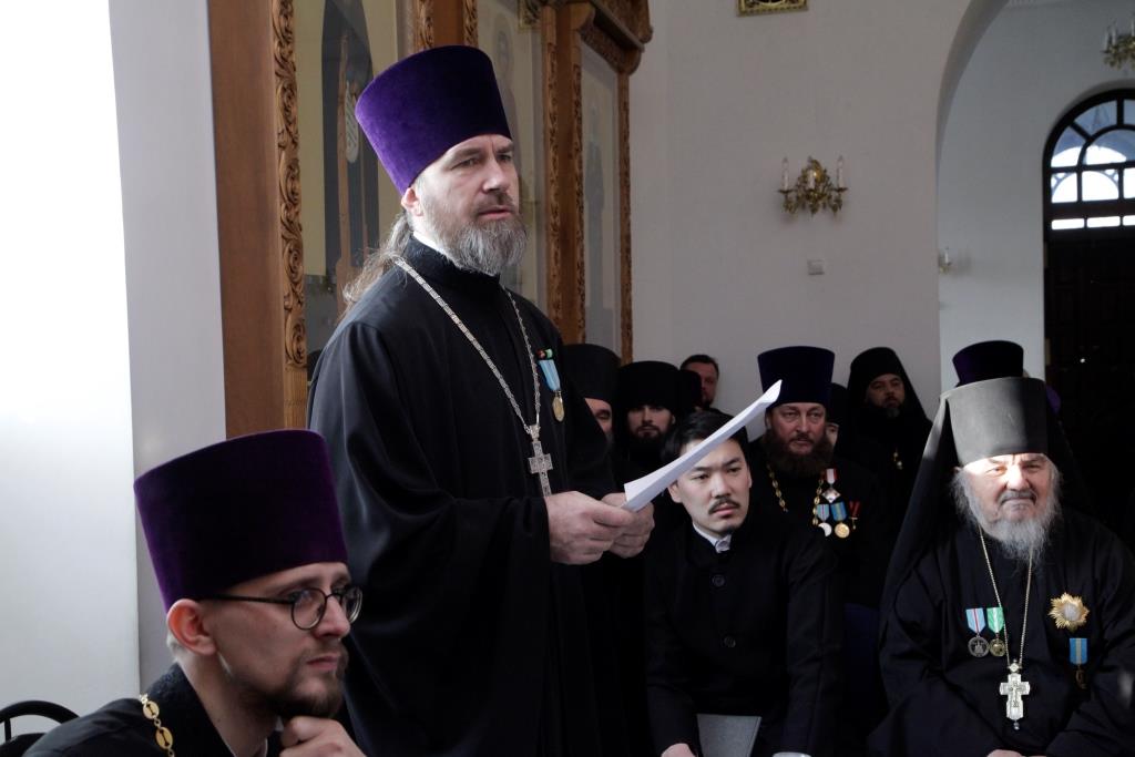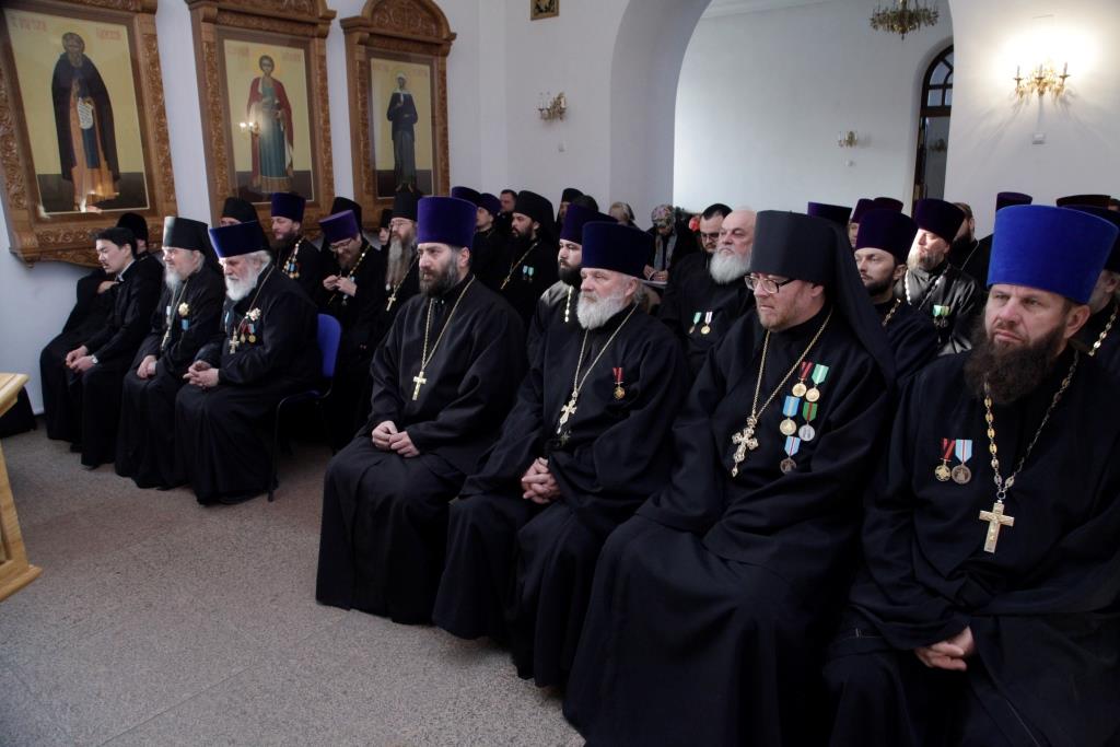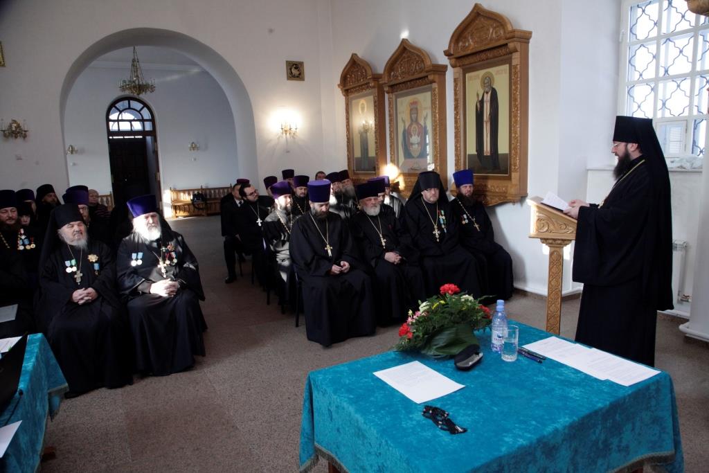 Перед началом собрания епископ Амфилохий удостоил высокой церковной награды – медали святых мучениц Веры, Надежды, Любви и матери их Софии руководителя Информационного отдела епархии Колосову М.В. за усердные труды на благо Святого Православия и в связи с 55-летием со дня рождения. Затем епископ Амфилохий представил духовенству секретаря Усть-Каменогорской и Семипалатинской епархии – И.О. Квана, который плодотворно трудится в епархиальном управлении с момента образования в пределах Восточного Казахстана новой епархии.