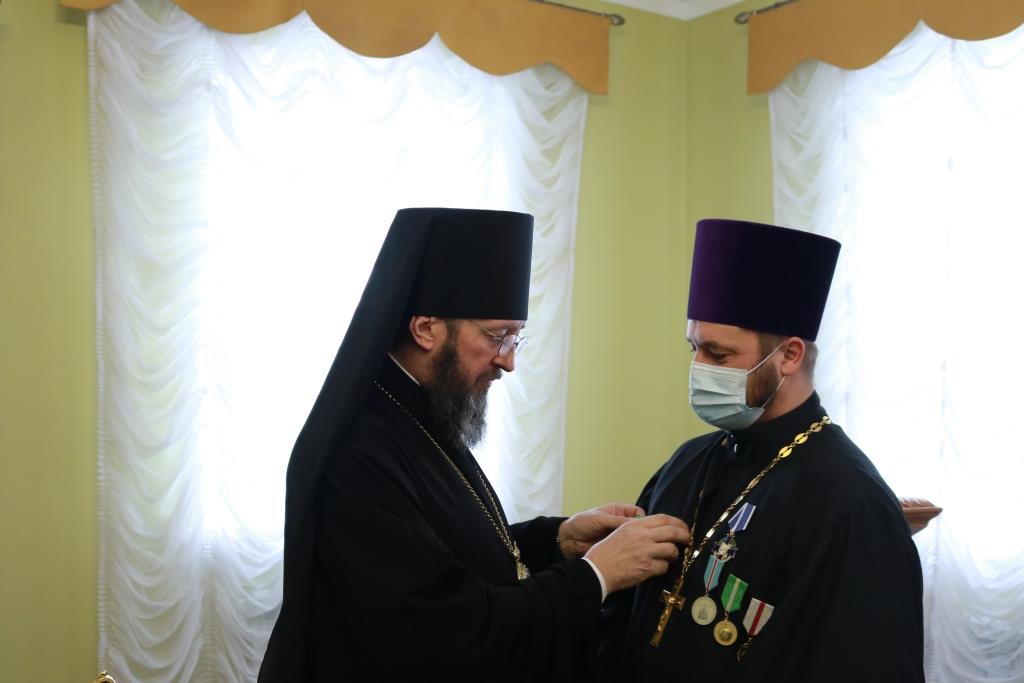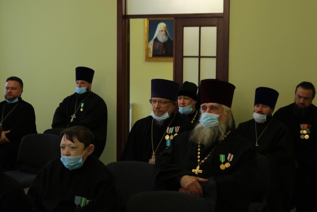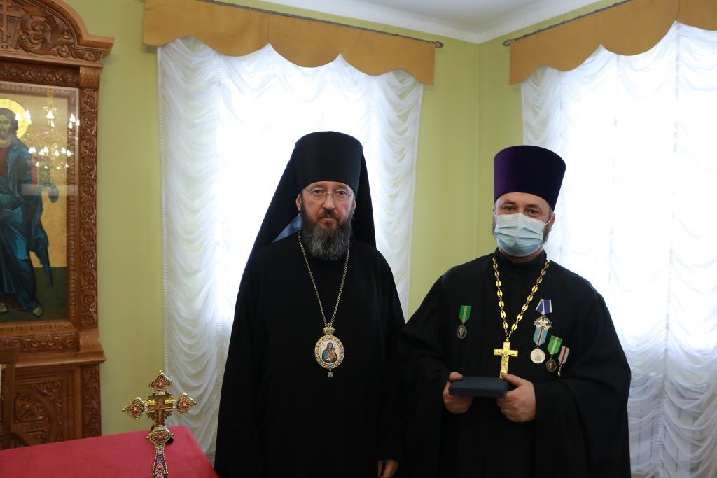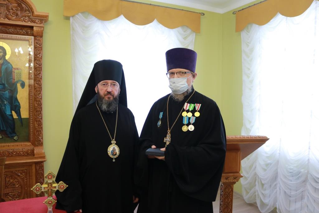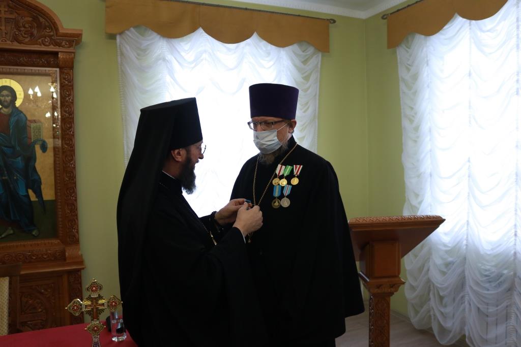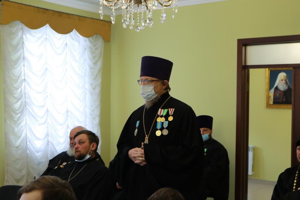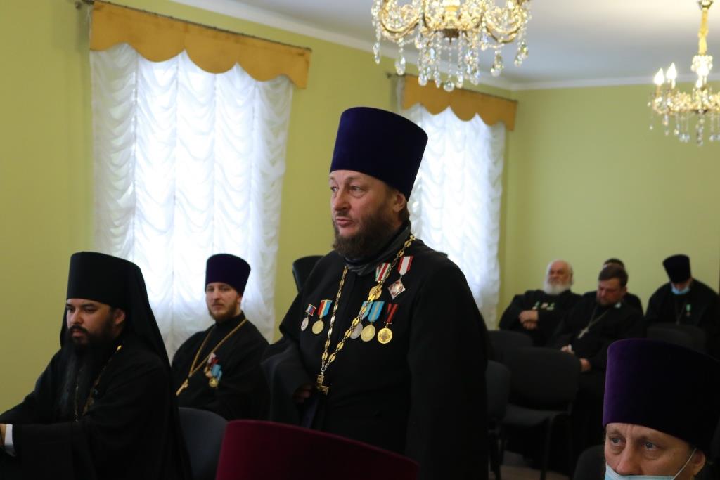 Затем Управляющий епархией выступил с докладом об итогах уходящего года. Так же епископ Амфилохий представил собранию нового духовника епархии – настоятеля Никольского храма города Риддера протоиерея Игоря Копылова. После доклада Преосвященнейший Владыка удостоил церковных наград клириков, отмечавших в 2021 году памятные даты. Протоиерей Игорь Копылов в связи с 25-летием служения в священном сане был удостоен ордена Православной Церкви Казахстана «За труды». Настоятель Владимирского храма поселка Новая Шульба иерей Евгений Нектеров в связи с 20-летием служения в священном сане был удостоен медали Православной Церкви Казахстана «За усердное служение». Настоятель Пророко-Илиинского храма села Урджар иеромонах Агафангел (Меринов) в связи с 15-летием служения в священном сане был удостоен медали Православной Церкви Казахстана «За усердное служение». Клирик Воскресенского кафедрального собора города Семипалатинска диакон Николай Белоконь в связи с 30-летием служения в священном сане был удостоен ордена Православной Церкви Казахстана «За усердное служение». Клирику Покровского храма города Усть-Каменогорска протодиакону Александру Якушеву в связи с 25-летием хиротонии был вручен приветственный адрес.