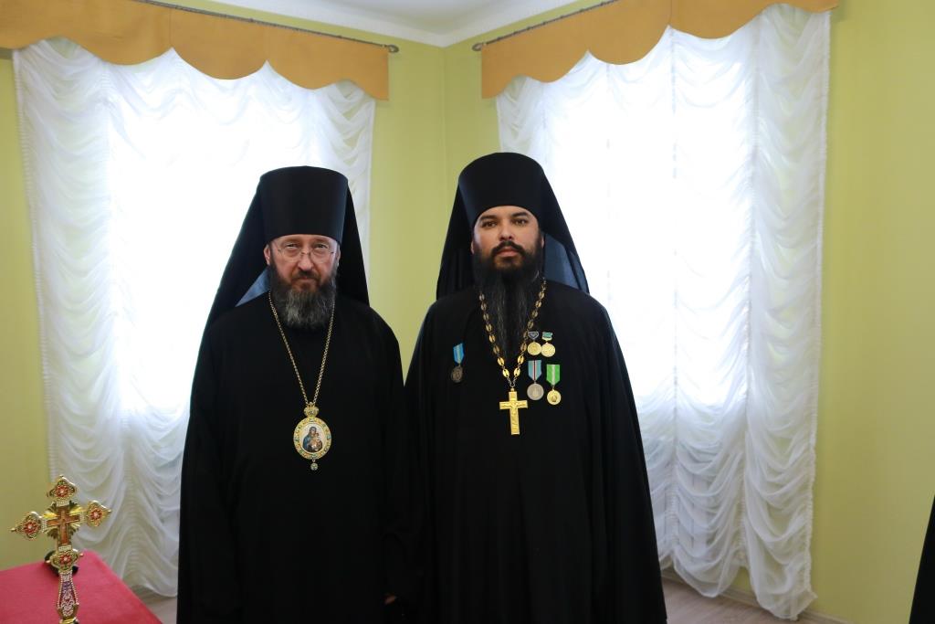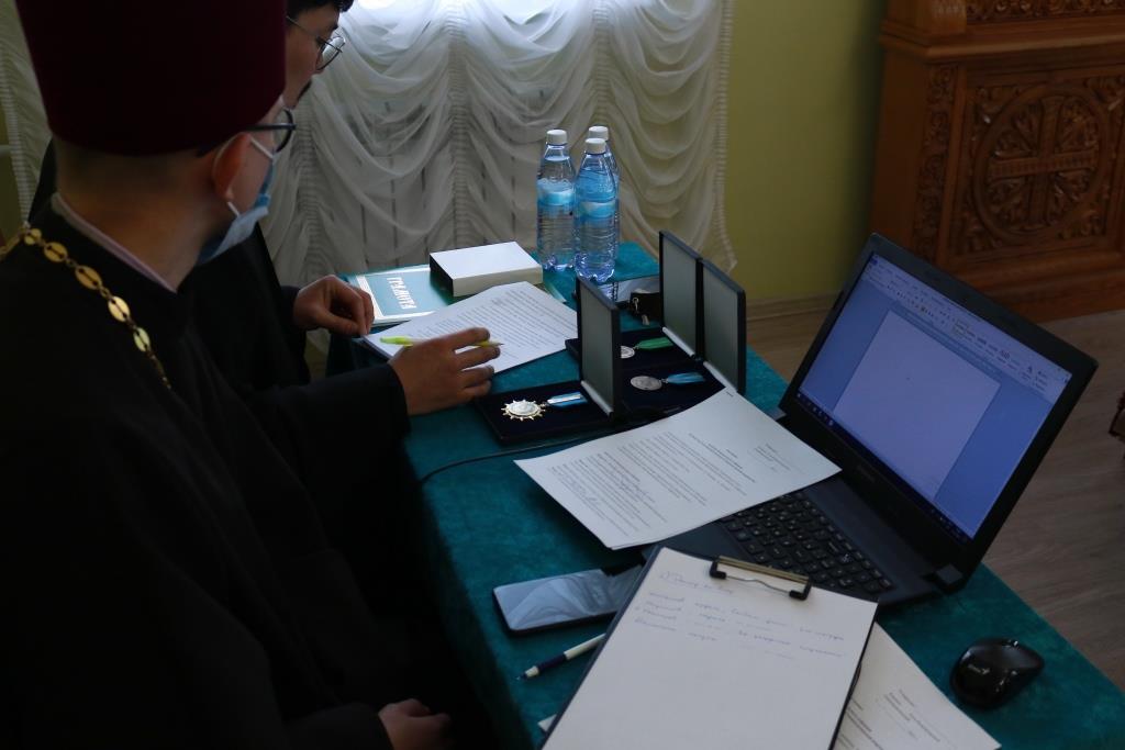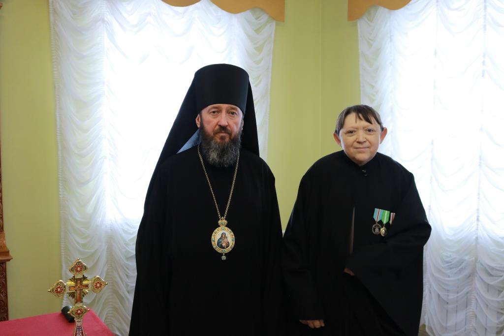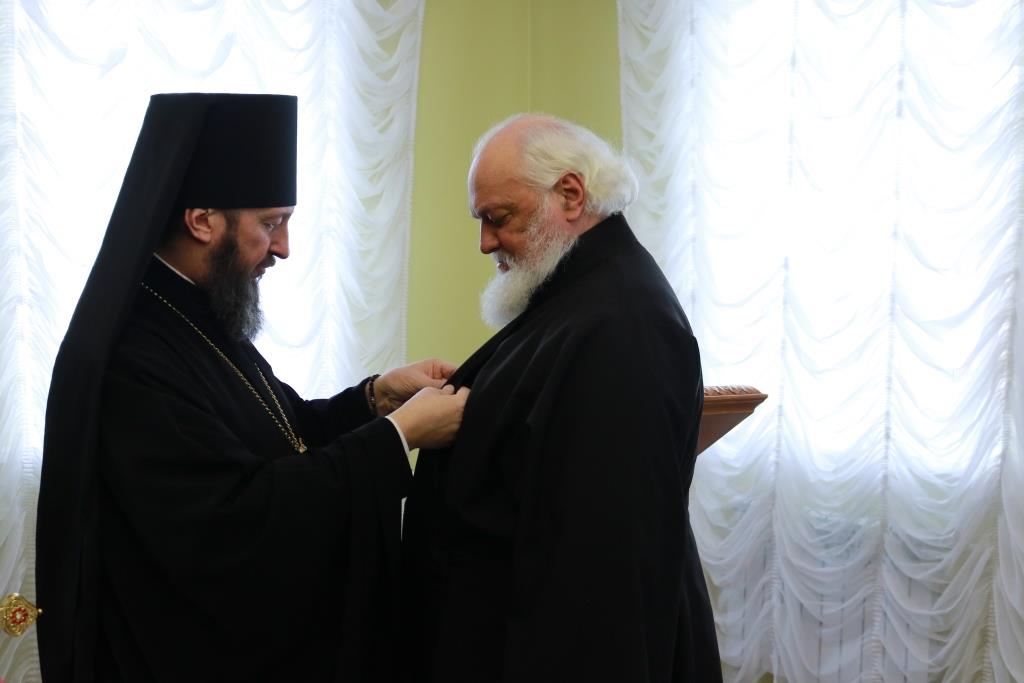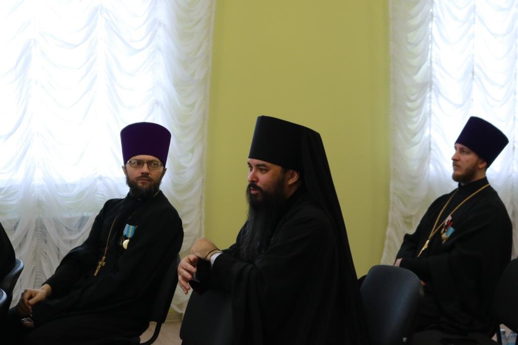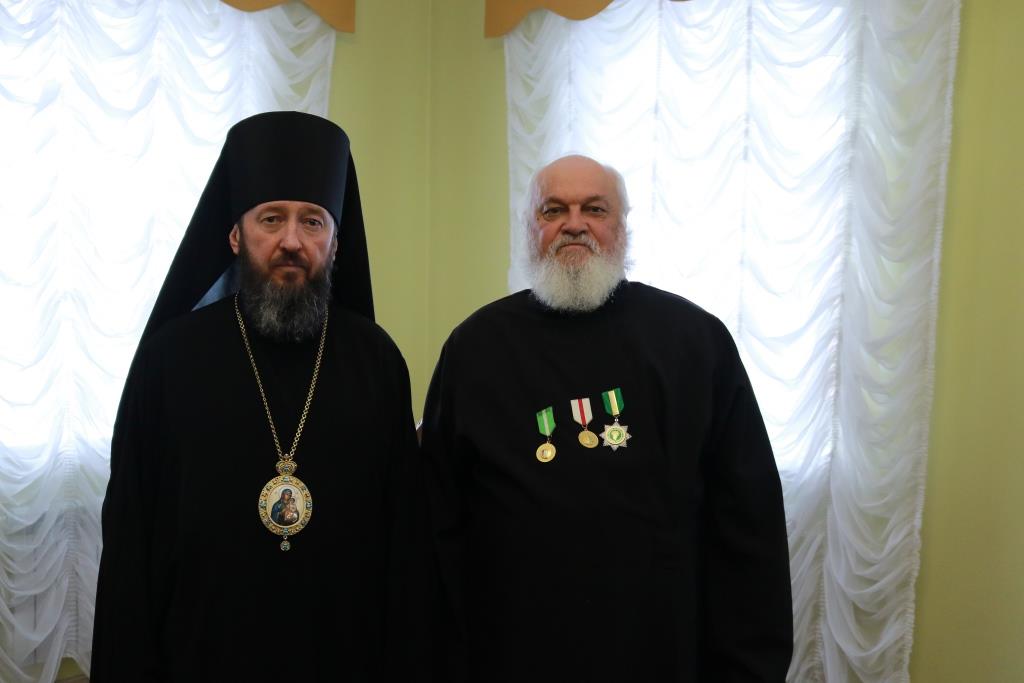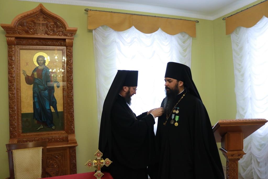 Затем Управляющий епархией выступил с докладом об итогах уходящего года. Так же епископ Амфилохий представил собранию нового духовника епархии – настоятеля Никольского храма города Риддера протоиерея Игоря Копылова. После доклада Преосвященнейший Владыка удостоил церковных наград клириков, отмечавших в 2021 году памятные даты. Протоиерей Игорь Копылов в связи с 25-летием служения в священном сане был удостоен ордена Православной Церкви Казахстана «За труды». Настоятель Владимирского храма поселка Новая Шульба иерей Евгений Нектеров в связи с 20-летием служения в священном сане был удостоен медали Православной Церкви Казахстана «За усердное служение». Настоятель Пророко-Илиинского храма села Урджар иеромонах Агафангел (Меринов) в связи с 15-летием служения в священном сане был удостоен медали Православной Церкви Казахстана «За усердное служение». Клирик Воскресенского кафедрального собора города Семипалатинска диакон Николай Белоконь в связи с 30-летием служения в священном сане был удостоен ордена Православной Церкви Казахстана «За усердное служение». Клирику Покровского храма города Усть-Каменогорска протодиакону Александру Якушеву в связи с 25-летием хиротонии был вручен приветственный адрес.