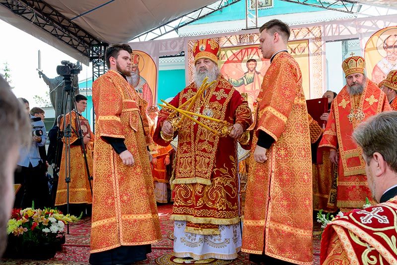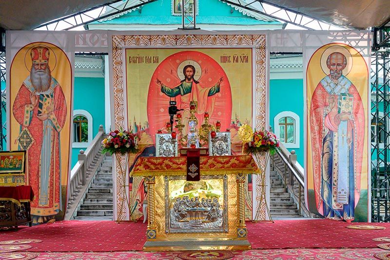 При пении величания святым апостолам митрополит Александр осенил ковчегом с евангельскими святынями и частицами мощей учеников Христовых четыре стороны света, призывая Божие благословение на молящихся, городу Алма-Ату и страну Казахстанскую.