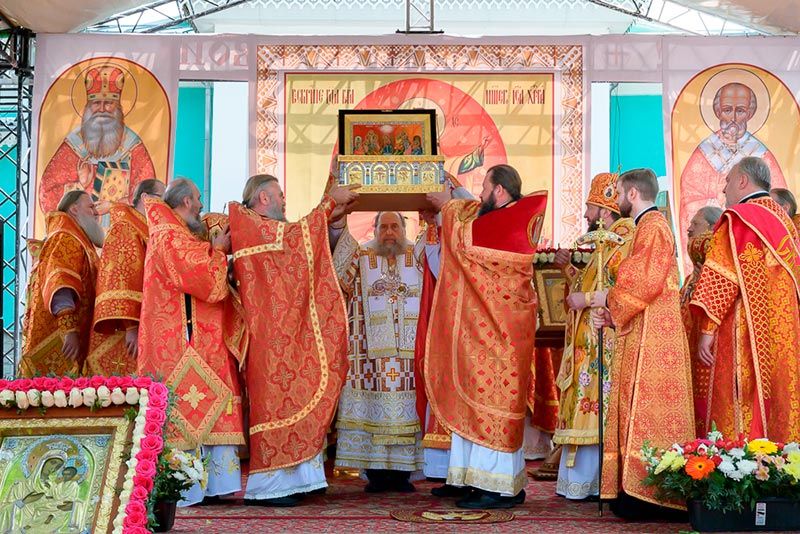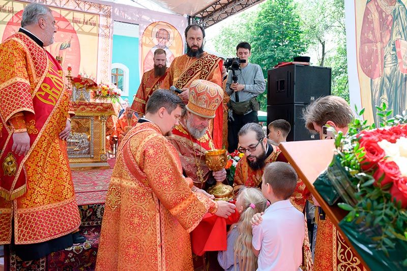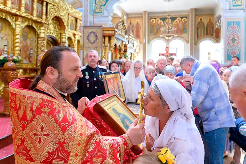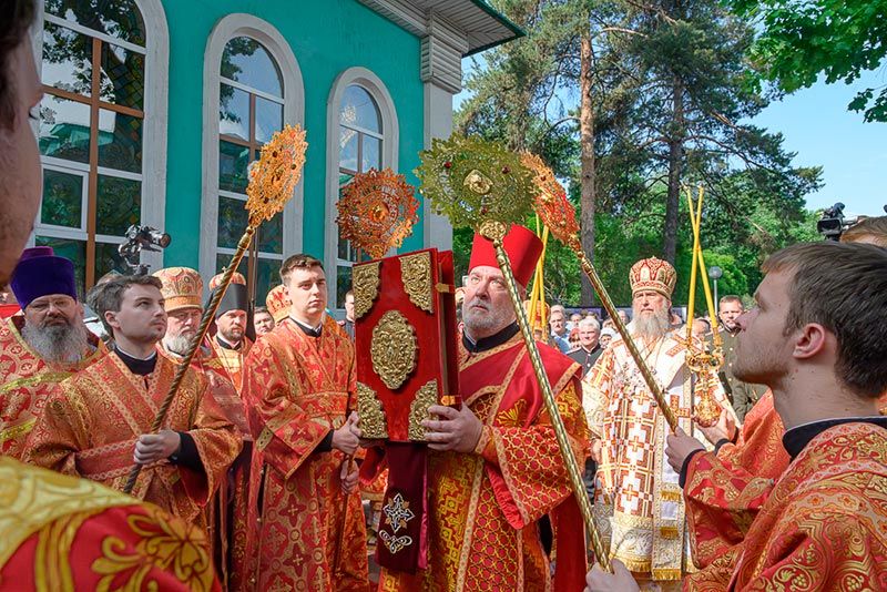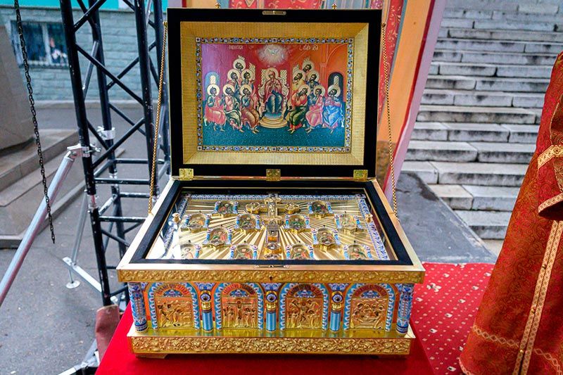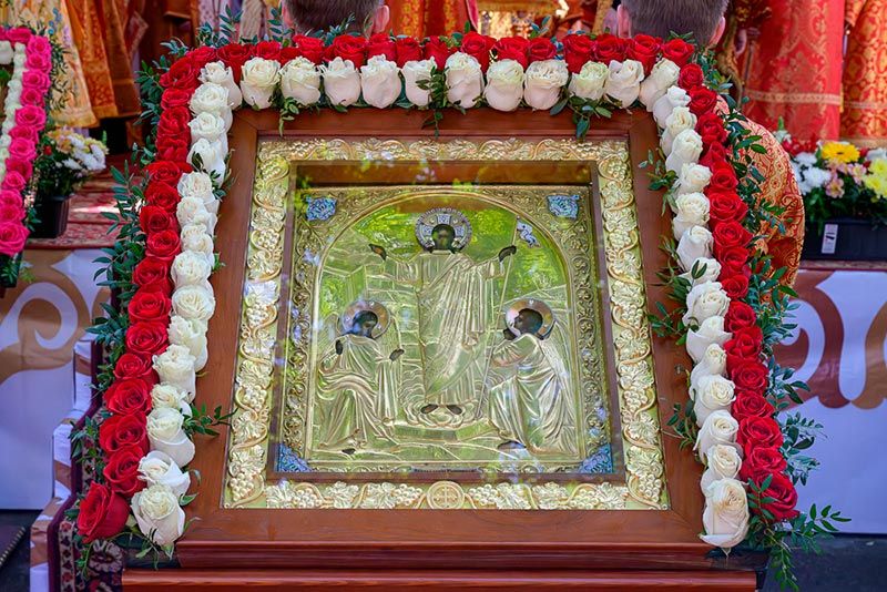 После чтения часов, перед началом Литургии, при пении пасхальных тропарей великая святыня – ковчег с частью Животворящего Креста Христова и частицами мощей 12-ти святых апостолов – была встречена у ворот храма, перенесен крестным ходом к месту совершения богослужения и установлен на престоле.