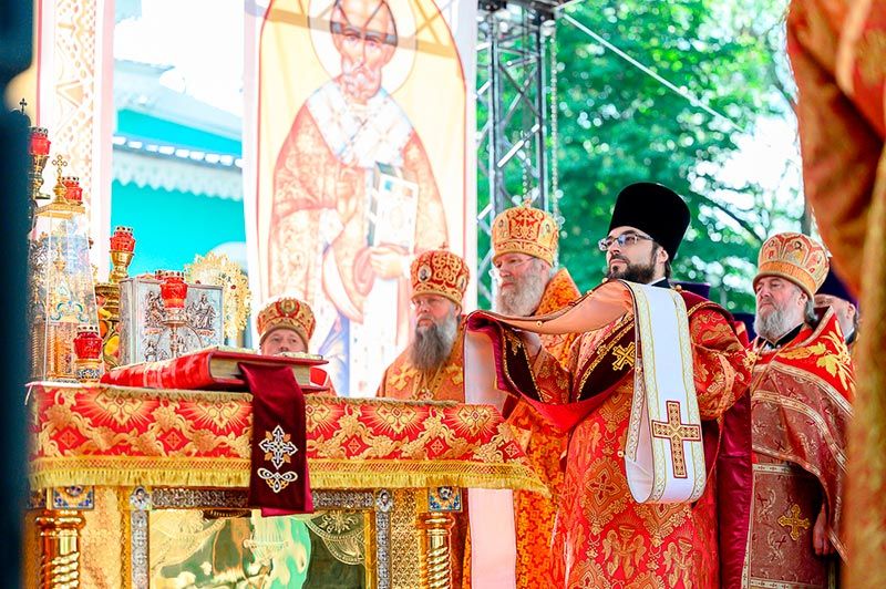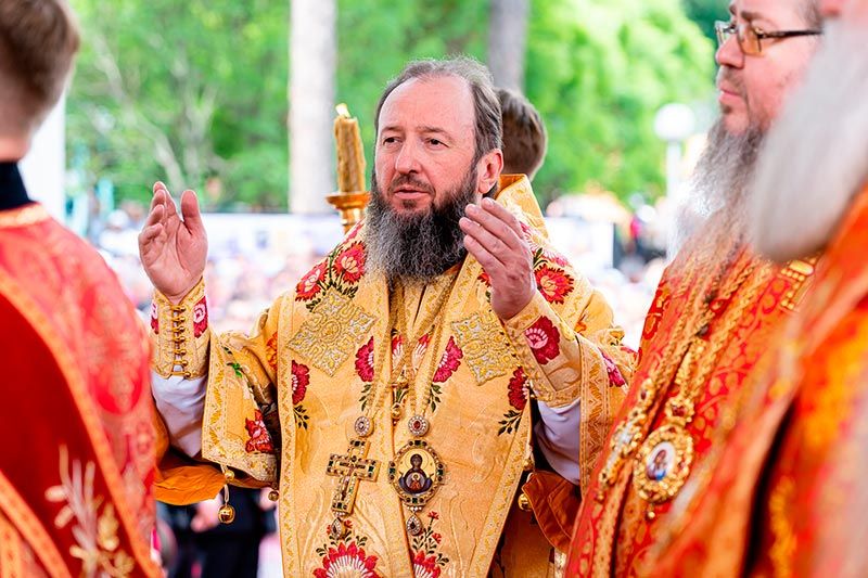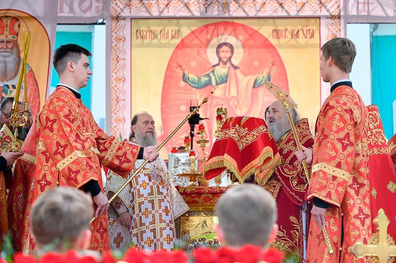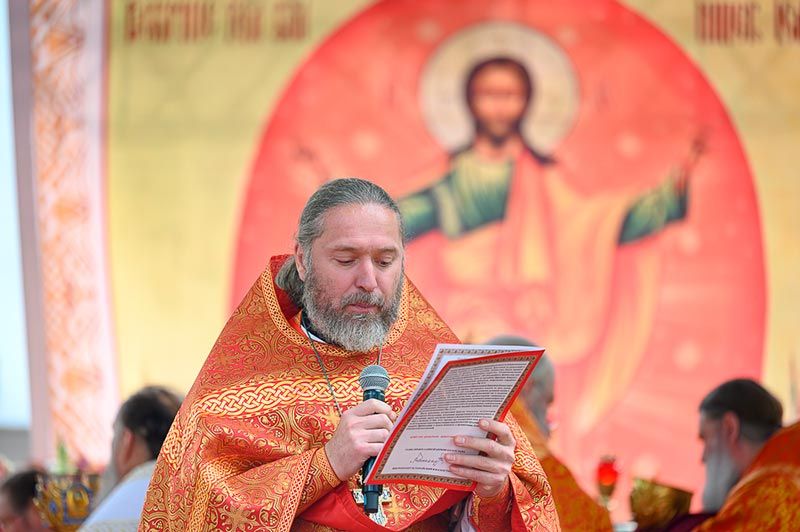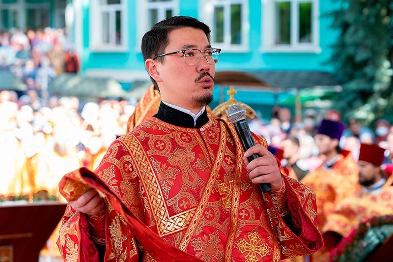 По запричастном стихе протоиерей Кирилл Шкляр огласил приветствие Святейшего Патриарха Кирилла и обращение митрополита Александра по случаю 20-летия учреждения Казахстанского Митрополичьего округа.