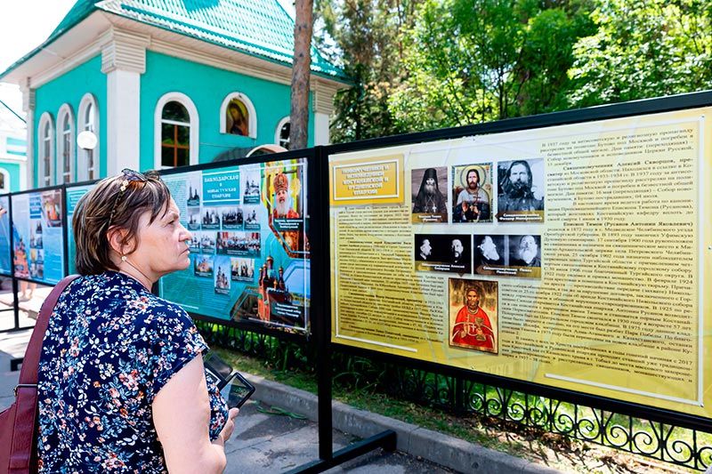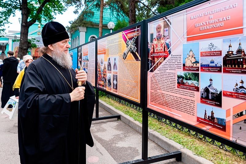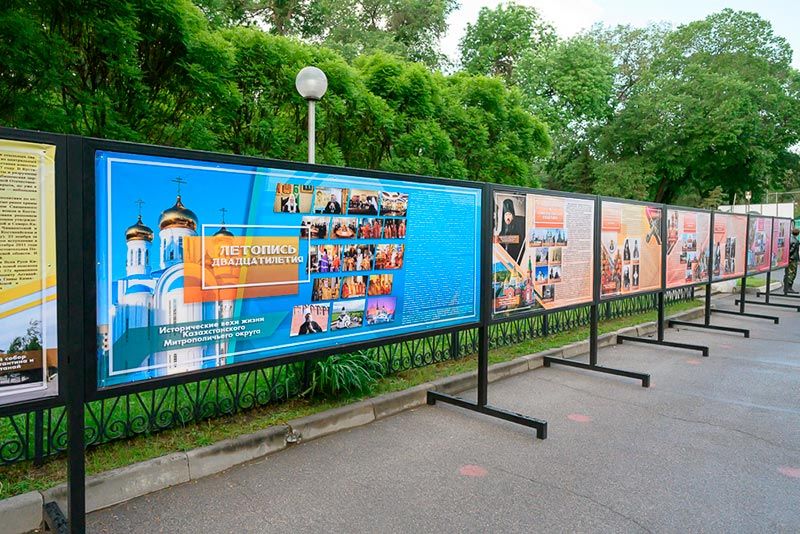 Фотографии и баннеры, представленные на экспозиции, рассказывают об истории и современной жизни епархий Казахстанского Митрополичьего округа.