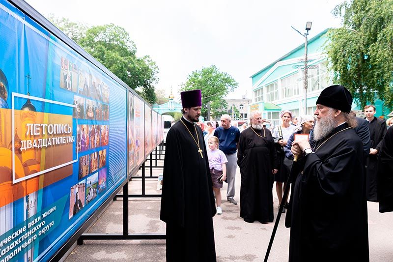 21 мая 2023 года. Алма-Ата. По благословению митрополита Астанайского и Казахстанского Александра на соборной площади перед Никольским храмом состоялось открытие выставки фотографий «Летопись 20-летия».