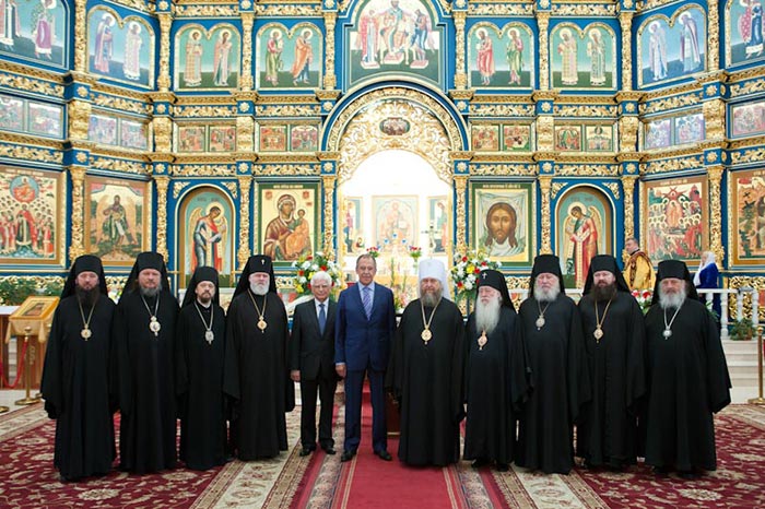 Глава российского МИДа в сопровождении Чрезвычайного и Полномочного Посла Российской Федерации в Республике Казахстан М.Н. Бочарникова прибыл в главный храм Казахстана перед началом Божественной Литургии.