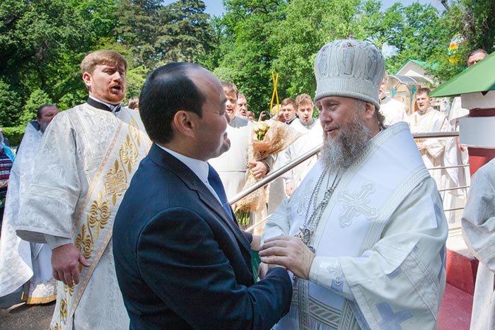 Архипастырей, священнослужителей и прихожан поздравил председатель Комитета по делам религий Казахстана Г.Н. Шойкин: «Сегодня весь православный мир отмечает один из важных праздников церковного года. В этот светлый день хочу пожелать вам мира и благополучия, успехов в деле духовного просвещения. Пусть ваши дома будут наполнены счастьем и радостью. В этом году православные верующие Алма-Аты отмечают 20-летие с момента передачи в вечное пользование Вознесенского собора Православной Церкви. Это историческое событие стало возможным именно благодаря мудрому решению Главы государства Нурсултана Абишевича Назарбаева. И сегодня, как мы видим, Вознесенский собор является не только местом молитвы православных христиан, но и одной из видных достопримечательностей и памятников города Алматы, его культурной и исторической составляющей». «Православная Церковь Казахстана всегда выступала надежным партнером государства в решении важнейших социальных и просветительских задач. Церковь в полной мере реализует свой огромный духовно-созидательный потенциал во благо процветания нашей Родины – Республики Казахстан. Особо хотел бы отметить, что Православная Церковь является постоянным участником диалога религий и цивилизаций. Делегации высокого уровня представляли Русскую Православную Церковь на всех четырёх съездах лидеров мировых традиционных религий, состоявшихся в Астане. С самого начала истории независимого Казахстана Митрополичий округ был и остается надежным партнером государства в проведении политики укрепления межконфессионального мира и стабильности в обществе. Сотрудничество государства и Православной Церкви и в дальнейшем будет развиваться по всем важным для государства и общества направлениям», - говорилось, в частности, в обращении Галыма Нурмагамбетовича.